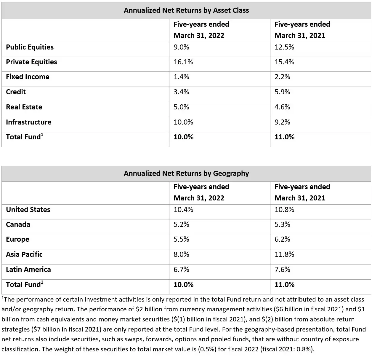 Five-year Fund returns by asset class and geography are reported in the tables below. A more detailed breakdown of performance by investment department is included on page 54 of the Fiscal 2022 Annual Report.